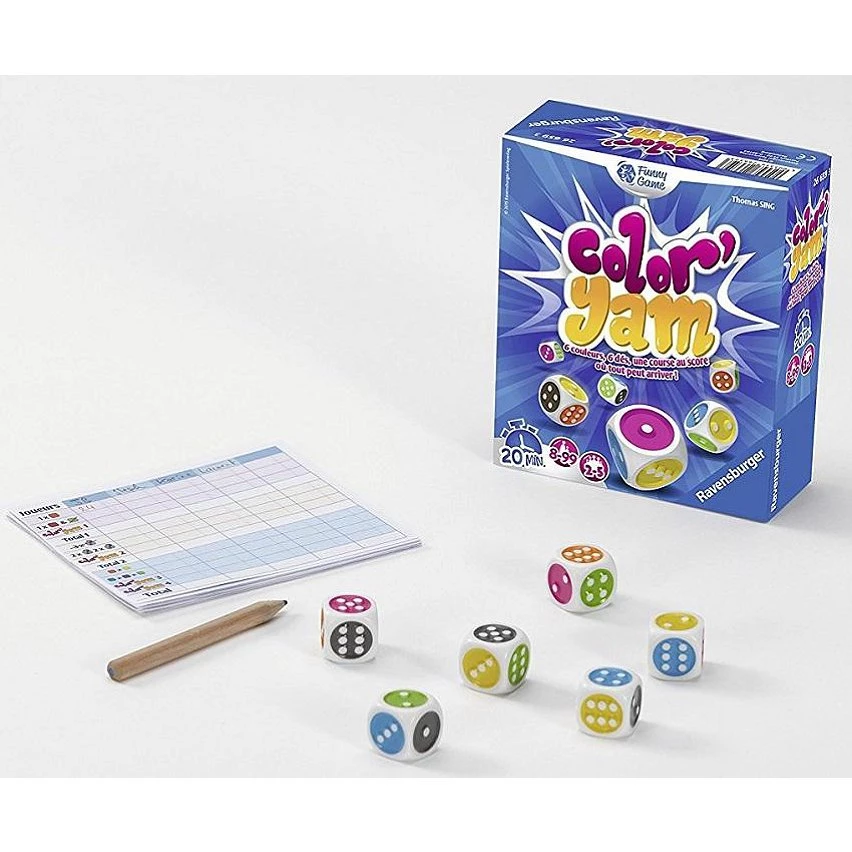 | Plus produit | JEU D\'AMBIANCE : Color\'Yam c\'est 6 couleurs, 6 dés différents et une course au score où tout peut arriver ! Evaluez vos chances et poussez vos adversaires à la faute! Mais attention, le vent peut vite tourner. Un subtil jeu de dés où la chance se mêle à la tentation. DES RÈGLES SIMPLES : A chaque tour, le joueur dispose de 3 lancers pour marquer un maximum de points et rafler la meilleure place. MAIS pour valider vos points vous devez remplir votre objectif. C\'est raté ? Heureusement que les cases Color\'Yam sont là pour vous sauver la mise. Le joueur qui obtient le plus gros score gagne la partie. NIVEAUX ADAPTÉS À TOUS : Pour les débutants, démarrez en douceur avec certaines variantes, soit en choisissant un objectif libre ou les résultats en Color\'Yam n\'ont plus besoin d\'être supérieurs aux précédents. Pour les pros, vous pouvez ajouter plus de tension dans vos parties…atteindre vos derniers Color\'Yam sera plus difficile ! PARTIES COURTES ET DIFFÉRENTES : des parties rapides et différentes à chaque fois, avec une dose de chance et une pointe de stratégie ! Vous recherchez un nouveau jeu de société qui rassemblera petits et grands, avec des règles simples et des parties rapides ? Color\'Yam est le cadeau idéal, petit prix, pour filles et garçons à partir de 8 ans CONTENU : 6 dés colorés, 1 bloc papier et 1 règle du jeu. De 2 à 5 joueurs et à partir de 8 ans. Une partie dure en moyenne 20 minutes. Vous en voulez plus ? Retrouvez nos autres jeux d\'ambiance pour jouer en famille : Paku Paku, Microbz, emoji Twist et même un jeu de cartes Villains ! |