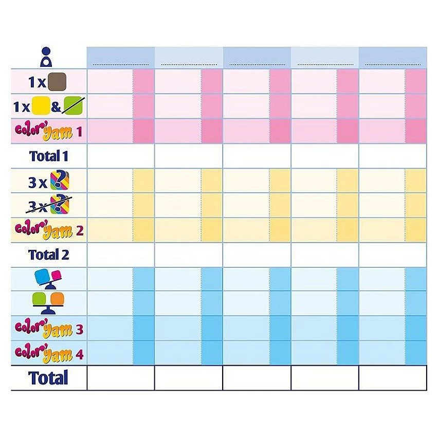 Color'Yam c'est 6 couleurs, 6 dés, une course au score où tout peut arriver ! À chaque tour, marquez un maximum de points pour rafler la meilleure place. Cependant, vous ne pouvez valider vos points qu'à la seule condition d'avoir rempli votre contrat. Un contrat ? Oui : avoir exactement une face rouge, plus de faces bleus que de jaunes, aucune couleur en 3 exemplaires, etc…. Mais attention : vous ne disposez que de 3 lancés ! Tenter d'optimiser son score, c'est prendre le risque d'invalider un contrat réussi… Heureusement les cases Color'Yam sont là pour vous sauver la mise … pour peu que vous ne soyez pas trop gourmand. Evaluez vos chances et poussez vos adversaires à la faute ! Mais attention, le vent peut vite tourner. Color'Yam, le subtil jeu de dés où la chance se mêle à la tentation.