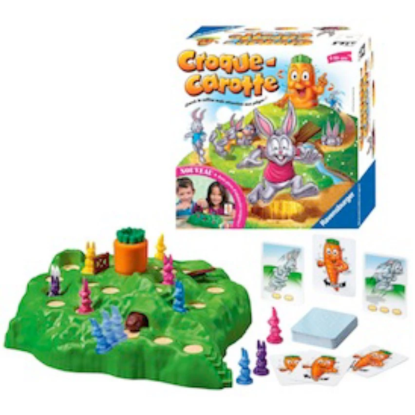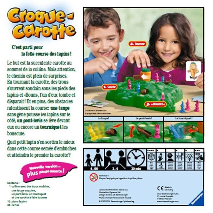 | Plus produit | UN GRAND CLASSIQUE : Le plus célèbre des jeux de parcours dont les enfants ET les parents ne se lassent pas ! Depuis 2001, Croque Carotte est considéré comme un classique des jeux pour enfants avec ses diverses nominations et prix. Retrouve ton Croque-Carotte pour des parties toujours plus endiablées, avec plein de rebondissements ! UN OBJECTIF CLAIR : Atteindre la succulente carotte au sommet de la colline avant tous les autres. Mais attention, le chemin qui mène jusqu\'à elle est plein d\'obstacles : des trous s\'ouvrent pour te piéger, une taupe te pousse sur le côté ou le pont-levis et la clôture gêne ta progression ! DES RÈGLES SIMPLES : Pioche une carte et avance votre lapin sur le chemin menant à la carotte, bondis par-dessus les autres et Clic ! La carotte tourne et un trou s\'ouvre sous tes pieds. Mince, ce lapin est perdu mais continue de jouer avec ceux qu\'il te reste ! Un jeu de tactique et de chance pour toute la famille ! PARTIES RAPIDES : Le jeu idéal pour un après-midi amusant pour 2 à 4 joueurs : grâce au suspense permanent, aux règles de jeu simples et aux tours de jeu courts, même les plus petits sont directement enthousiasmés. Croque Carotte est un jeu très apprécié des enfants et des parents ! Convient parfaitement comme cadeau d\'anniversaire, cadeau de Noël CONTENU : 1 colline avec des trous mobiles, une taupe coquine, un pont-levis, une clôture et une carotte à faire tourner, 16 pions lapins, 48 cartes, 1 règle du jeu. Fonctionne sans pile ! Des éléments de jeu de qualité pour aider votre enfant dans son apprentissage et sa motricité. Existe aussi en format de boîte compact en version Coup de Coeur |