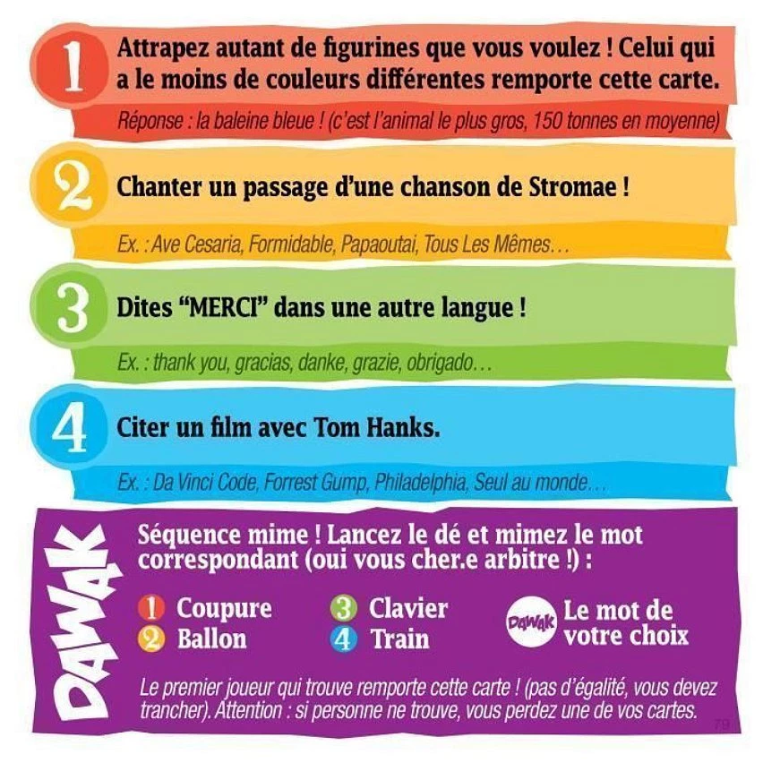 Lancez le dé, vous savez jouer !! Chaque tour, le dé indique quelle question énoncer : cinéma, histoire, bande dessinée, vie quotidienne … aucun sujet n'est épargné ! Citez un album de Tintin Combien de j compte le mot magie ? Quel objet se cache derrière ces lettres N O C Y R A ? Citer un mot commençant par la lettre p et finissant par la lettre n Combien de joueurs portent un jean Comment s'appelle le doigt le plus à gauche de votre main droite ?. Le plus rapide à répondre remporte la carte ! Mais restez sur vos gardes : à n'importe quel moment, il faudra attraper les figurines au centre de la table… Et si vous obtenez une face Dawak le grand n'importe quoi commence : des défis, du chant, des mimes, une macédoine de challenges drôles et variés. Nul ne sait ce qui peut arriver ! Etes-vous prêt à tout pour remporter 7 cartes en premier ? Dawak un jeu d'ambiance simple et rapide, pour rire et délirer en famille ou entre amis.