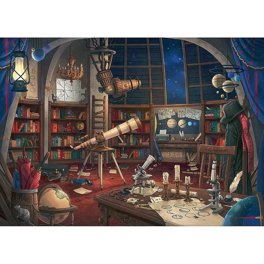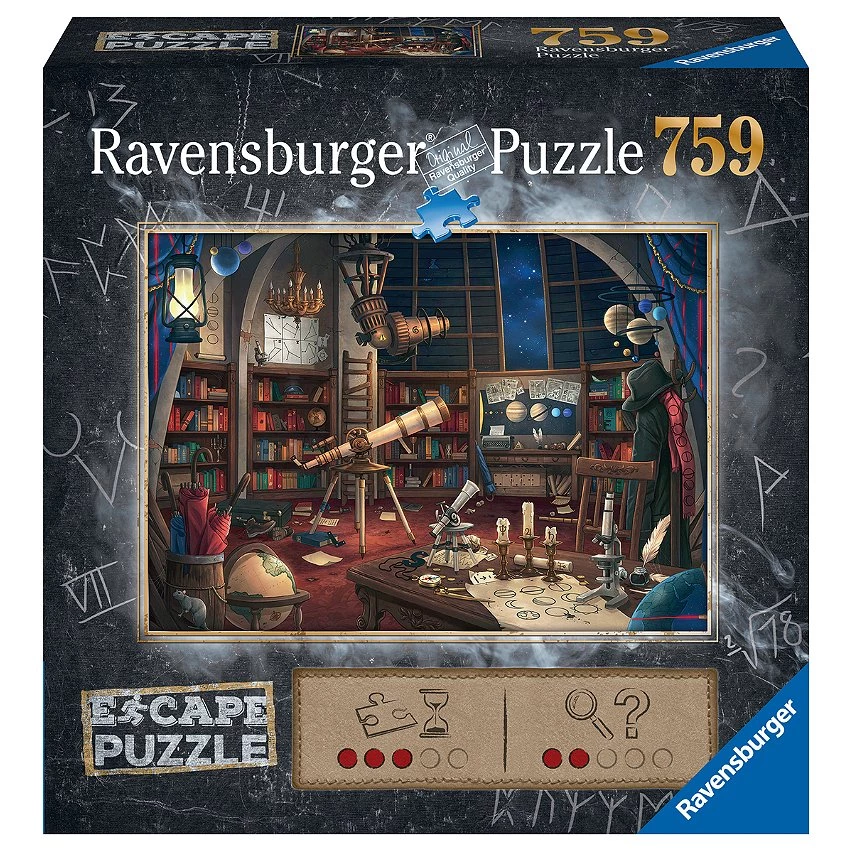 | Plus produit | Découvrez la première offre de puzzles inspirée des jeux d\'évasion et des Escape Rooms ! Un astéroïde fonce sur la Terre et menace de tout détruire ! Le professeur de cet observatoire astronomique est parti en vous laissant de quoi anéantir la menace, mais saurez-vous réunir les pièces manquantes ? Inspirée du jeu de société Disney Villainous par Ravensburger, cette illustration exclusive met à l\'honneur l\'univers machiavélique du dieu des enfers Hadès, le célèbre méchant Disney du monde d\'Hercule ! Pièce après pièce, révélez tous les détails des scènes les plus mémorables de ce dessin animé d\'exception, aux côtés d\'Hadès et de ses démons Pe Contenu : un puzzle de 759 pièces, un guide de jeu, une enveloppe contenant la solution finale.Bonus : des indices supplémentaires à retrouver en ligne pour vous aider Dimensions du puzzle : 70 x 50 cm |