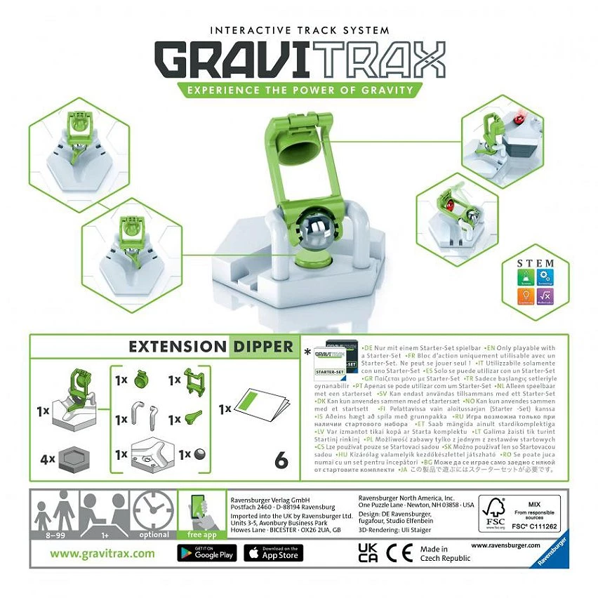 | Plus produit | DIPPER : Un bloc innovant qui fait descendre la bille d\'un niveau sur une hauteur équivalente à 3,5 blocs de construction. Avec son mouvement de balancier, le Dipper permet aussi de mieux maitriser la vitesse de la bille pour l\'aider à franchir certains obstacles. Grâce à l\'aiguillage intégré, la bille peut repartir d\'un côté ou l\'autre du Dipper. MODULABLE A L\'INFINI et COMPATIBLE avec tous les produits GraviTrax. Cet élément se joue avec au moins un Starter Set (indispensable pour démarrer) puis se combine avec toutes les gammes GraviTrax. Découvrez un large choix de sets d\'extension et d\'éléments pour enrichir vos circuits et imaginer un nombre illimité de parcours différents. CONTENU : 1 bloc Dipper, 4 blocs de construction épais, 1 guide d\'utilisation illustré et en français UN CADEAU IDEAL pour les filles et les garçons à partir de 8 ans, et pour les fans de construction de tous âges ! Fabriqués en Europe avec des matériaux de grande qualité, GraviTrax est fait pour durer et garantit des heures de jeu et d\'assemblage, seul ou à plusieurs. Une idée cadeau parfaite pour un anniversaire ou pour Noël. JEU EDUCATIF STEM : GraviTrax est un système de construction très ludique qui permet aux enfants d\'expérimenter des lois physiques comme la gravité, le magnétisme ou la force cinétique. En manipulant les blocs et en testant leurs propres assemblages, ils développent à la fois leur créativité et leur compréhension de ces principes scientifiques. |