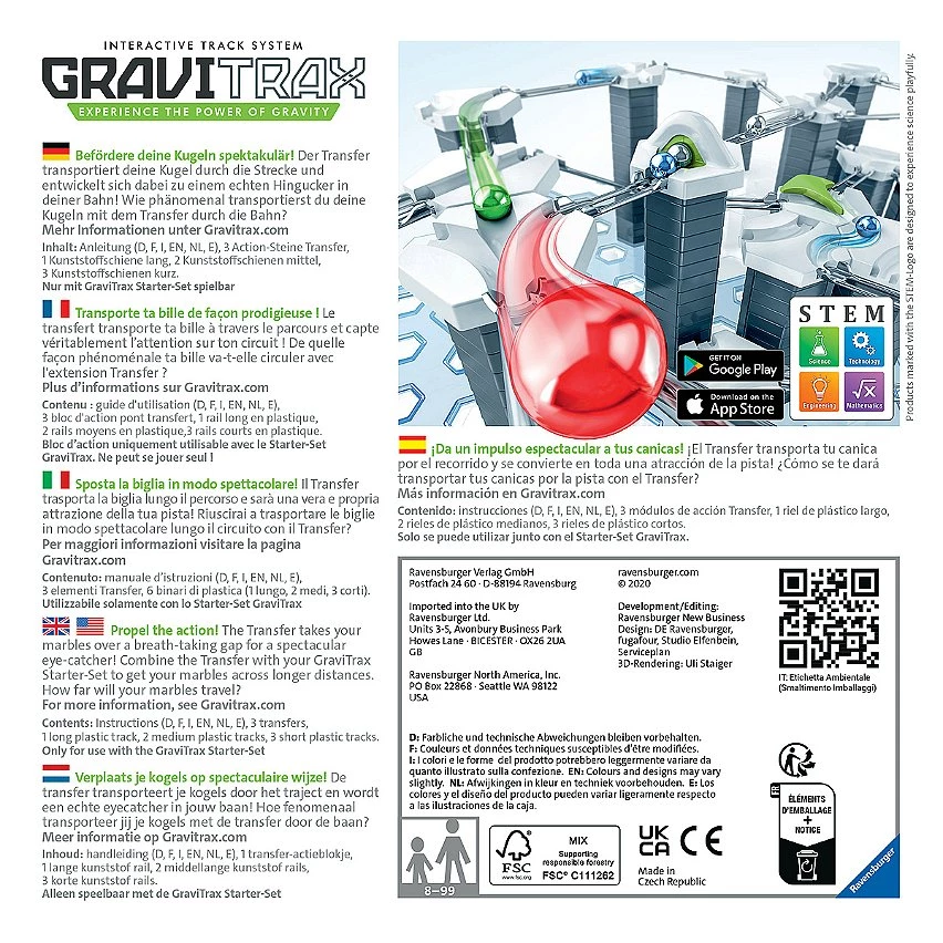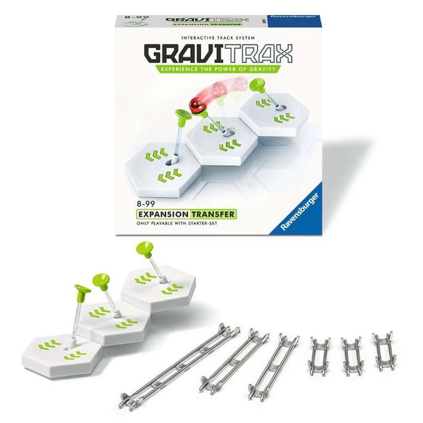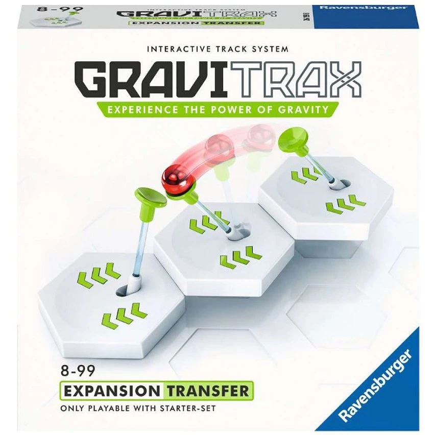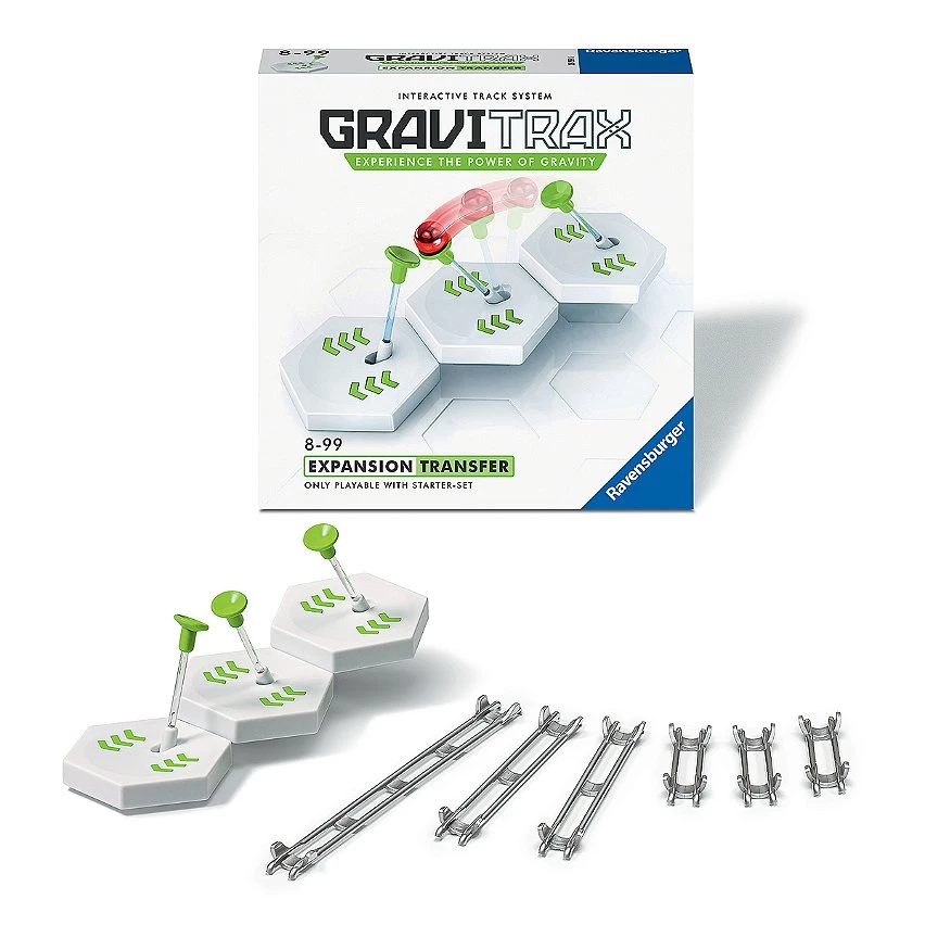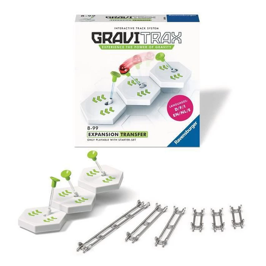 | Plus produit | TRANSFERT : Un élément pour booster ses circuits de billes GraviTrax ! Ce bloc permet à une bille de descendre avec style et originalité, en basculant d\'un pilier à l\'autre. Après le dernier pilier, la bille atterrit sur un bloc classique et peut ainsi poursuivre sa course. MODULABLE A L\'INFINI et COMPATIBLE avec tous les produits GraviTrax. Cet élément se joue avec au moins un Starter Set (indispensable pour démarrer) puis se combine avec toutes les gammes GraviTrax. Découvrez un large choix de sets d\'extension et d\'éléments pour enrichir vos circuits et imaginer un nombre illimité de parcours différents. CONTENU : 3 blocs Transfert, 1 rail long, 2 rails moyens, 3 rails courts, 1 guide d\'utilisation illustré et en français UN CADEAU IDEAL pour les filles et les garçons à partir de 8 ans, et pour les fans de construction de tous âges ! Fabriqués en Europe avec des matériaux de grande qualité, GraviTrax est fait pour durer et garantit des heures de jeu et d\'assemblage, seul ou à plusieurs. Une idée cadeau parfaite pour un anniversaire ou pour Noël. JEU EDUCATIF STEM : GraviTrax est un système de construction très ludique qui permet aux enfants d\'expérimenter des lois physiques comme la gravité, le magnétisme ou la force cinétique. En manipulant les blocs et en testant leurs propres assemblages, ils développent à la fois leur créativité et leur compréhension de ces principes scientifiques. |