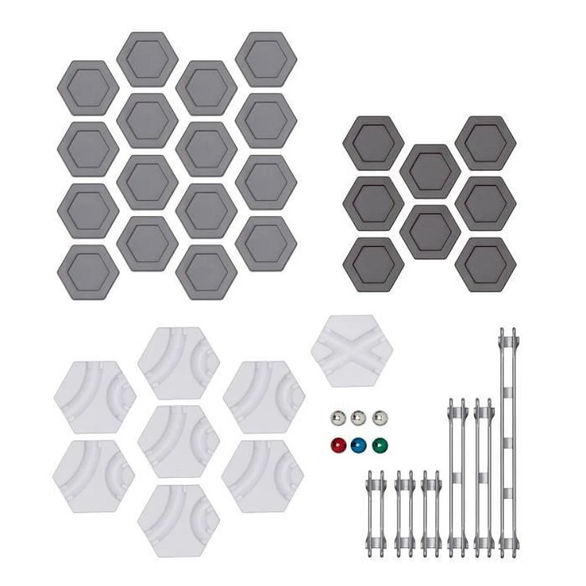 | La boîte contient | 44 éléments : 16 blocs de construction épais, 8 blocs de construction fins, 7 virages, 1 intersection, 1 rail long, 2 rails moyens, 3 rails courts, 6 billes |