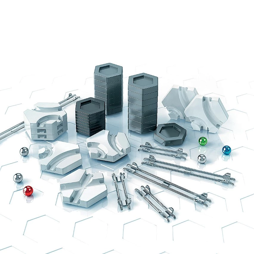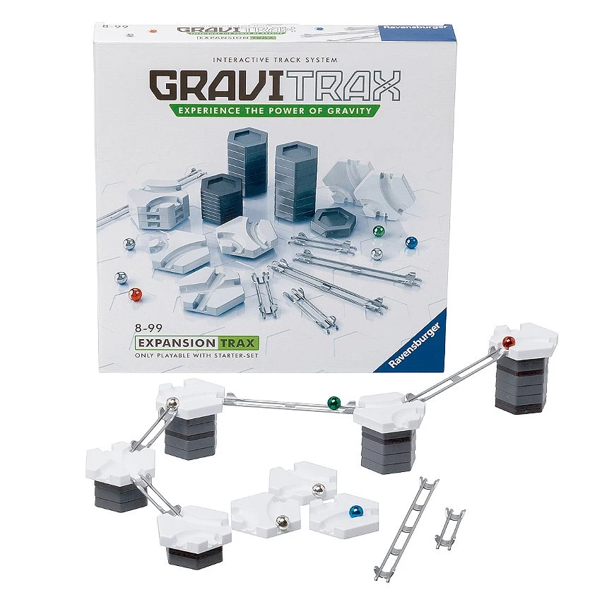 | Plus produit | RAILS : Plus de rails pour encore plus de possibilités de jeu et d\'assemblage ! Avec ses nombreux blocs de construction, virages et rails supplémentaires, ce set d\'extension permet d\'agrandir ses circuits de billes GraviTrax. Inclut : une recharge de 6 billes. MODULABLE A L\'INFINI et COMPATIBLE avec tous les produits GraviTrax. Ce set d\'extension se joue avec au moins un Starter Set (indispensable pour démarrer) puis se combine à toutes les gammes GraviTrax. Découvrez un large choix de sets d\'extension et d\'éléments pour enrichir vos circuits et imaginer un nombre illimité de parcours différents. CONTENU : [44 éléments au total] 16 blocs de construction épais, 8 blocs de construction fins, 7 virages, 1 intersection, 1 rail long, 2 rails moyens, 3 rails courts, 6 billes, 1 guide d\'utilisation illustré et en français UN CADEAU IDEAL pour les filles et les garçons à partir de 8 ans, et pour les fans de construction de tous âges ! Fabriqués en Europe avec des matériaux de grande qualité, GraviTrax est fait pour durer et garantit des heures de jeu et d\'assemblage, seul ou à plusieurs. Une idée cadeau parfaite pour un anniversaire ou pour Noël. JEU EDUCATIF STEM : GraviTrax est un système de construction très ludique qui permet aux enfants d\'expérimenter des lois physiques comme la gravité, le magnétisme ou la force cinétique. En manipulant les blocs et en testant leurs propres assemblages, ils développent à la fois leur créativité et leur compréhension de ces principes scientifiques. |