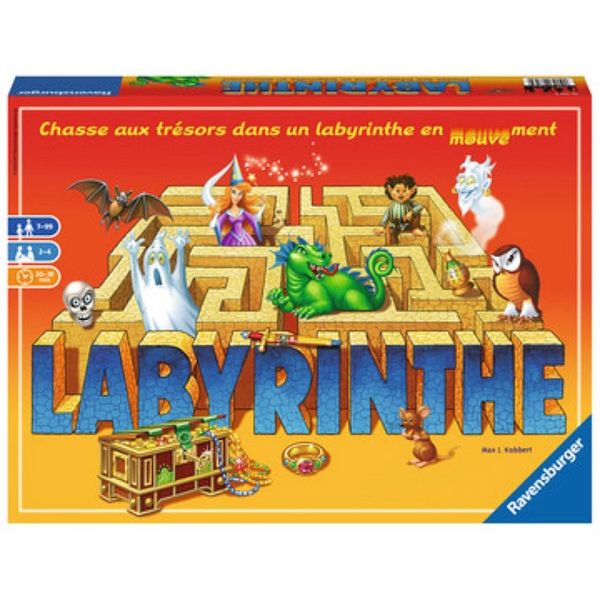 Depuis sa création en 1986, Labyrinthe enthousiasme les familles. Une palpitante chasse aux trésors dans un labyrinthe en mouvement ! Chaque joueur déplace les murs du labyrinthe pour se frayer un chemin qui mène aux trésors. On va de surprises en surprises. On croit pouvoir atteindre un trésor quand soudain les murs coulissent Qui arrivera à déjouer les pièges de ce célèbre labyrinthe et être le premier à récolter ses fabuleux trésors ? Un jeu de réflexion et de suspense pour toute la famille, de 2 à 4 joueurs à partir de 7 ans, qui fait désormais partie des grands classiques du jeu de société.