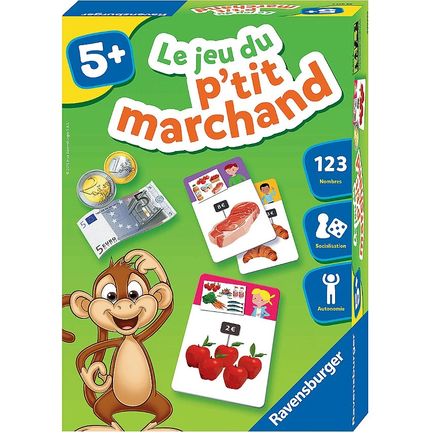 | Plus produit | Une activité ludique pour se familiariser aux petits achats de tous les jours ! C\'est une première approche pour que l\'enfant prenne conscience de la valeur de l\'argent et de ce qu\'il peut en faire. Il pourra faire ses petits achats, compter pour payer et rendre la monnaie. Devenir un petit marchand n\'a jamais été aussi facile ! Se familiariser avec la monnaie et les échanges marchands prépare les enfants à la vie de tous les jours. Ce jeu propose plusieurs listes de courses, basées sur le principe du jeu des 7 familles. Ce jeu va favoriser l\'approche du calcul mental et les familiariser avec les pièces et les billets (compter, rendre la monnaie…). Dans ce jeu les enfants jouent à acheter ou vendre des aliments, à constituer un repas complet tout en prenant soin de bien gérer leur porte-monnaie. Les enfants apprennent à faire leurs premiers achats, compter leur argent pour payer, rendre la monnaie et la vérifier. Contenu: 35 cartes achat, 4 cartes porte-monnaie, 1 tableau guide rendu de monnaie, 8 billets, 78 pièces. Ce produit est composé de matériaux issus de forêts bien gérées certifiées FSC®, de matériaux recyclés et de matériaux issus dautres sources contrôlées (FSC-C111262). Produit imaginé en France et fabriqué en Europe. Ce coffret s\'accompagne d\'une collection entière pour les enfants dès 5 ans. Le coffret \'Jeux de lettres\' et le coffret \'L\'heure\' composé d\'une grande horloge à manipuler pour appréhender la notion du temps. Retrouver pour chaque âge de 2 à 5 ans une multitude de jeux basés sur les notions essentielles et sur des connaissances à acquérir. |