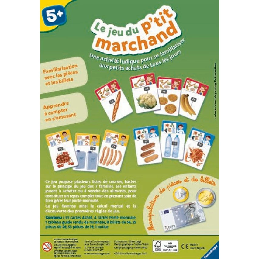 Se familiariser avec la monnaie et les échanges marchands prépare les enfants à la vie de tous les jours. « Le jeu du p'tit marchand » propose plusieurs listes de courses, basées sur le principe du jeu des 7 familles. Les enfants jouent à acheter ou vendre des aliments, pour constituer un repas complet tout en prenant soin de bien gérer leur porte-monnaie. Ainsi tout en s'amusant, les joueurs apprennent à faire leurs premiers achats, compter leur argent pour payer, se familiariser avec les pièces et les billets, rendre la monnaie et la vérifier. Ce jeu favorise ainsi le calcul mental et l'appréhension du jeu à plusieurs. Dès 5 ans. Ce produit est composé de matériaux issus de forêts bien gérées certifiées FSC®, de matériaux recyclés et de matériaux issus dautres sources contrôlées (FSC-C111262).