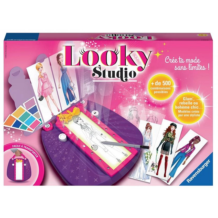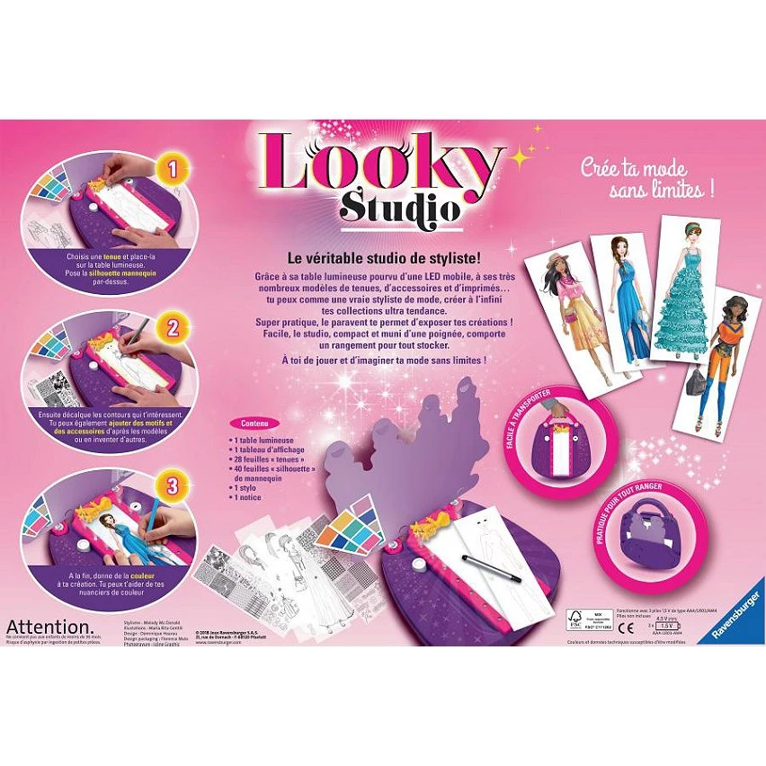 | Plus produit | CRÉE TA MODE SANS LIMITES Ton studio de styliste pour créer tes collections de mode ! Plus de 500 combinaisons de modèles sont possibles allant du style glamour au rebelle en passant par le Bohème ou le chic ! Les modèles ont été dessinés par une véritable styliste de mode. Dès 6 ans. LA MACHINE DE STYLISTE A EMPORTER Ton studio de styliste est pourvu d\'une LED mobile pour t\'aider à reproduire les modèles pas à pas. Muni d\'une poignée, il est transportable et permet de ranger tout ton matériel à l\'arrière. La mode n\'aura plus de secret pour toi, où que tu sois ! FAVORISE CONCENTRATION ET AUTONOMIE Loin des écrans, cette activité créative allie dextérité et précision pour développer l\'habilité manuelle des enfants. Une fois finis, expose tes modèles grâce au paravent inclus ou offre-les à tes proches. DÉVELOPPE TA COLLECTION avec les Looky Sketch books : Summertime (18125), Robes de soirée (18082), Petits animaux (18083) et Fantasy (20183). Utilise les modèles avec ton Looky Studio ! TOUT EST INCLUS pour devenir styliste : 1 module lumineux transportable avec rangement, 1 grand panneau paravent, 28 feuilles de tenues, 40 feuilles de silhouettes à looker, 1 stylo-feutre noir fin, 3 feuilles de nuancier et 1 notice. Nécessite 3 piles LR03 non fournies. |
