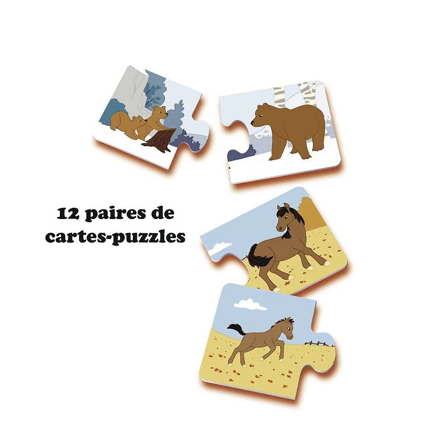 | Plus produit | LE CADEAU IDÉAL : un jeu incontournable pour apprendre à réunir les mamans et leurs bébés animaux ! Avec les cartes puzzles, l\'enfant joue à associer un bébé animal à sa maman. Des images modernes et des animaux très mignons. Connaître l\'environnement des animaux n\'a jamais été aussi simple. À PARTIR DE 2 ANS : les enfants sont fascinés par les animaux, ils peuvent découvrir les animaux dans leur environnement et apprendre leur nom. Plus qu\'un jouet, ce jeu favorise le sens de lobservation, le développement du langage, du vocabulaire lié aux animaux et de la motricité fine. JOUER AVEC LES ANIMAUX : les enfants apprendront à retrouver les bébés animaux des 12 mamans. Les enfants découvrent une jument et son poulain, une vache et son veau dans un pré, une cane et ses canetons dans la mare, etc. Grâce aux pièces de puzzle auto-correctives, les enfants peuvent vérifier eux-mêmes sils ont correctement associé les images. CONTENU : 12 paires de cartes-puzzles, 1 notice. Ce produit est composé de matériaux issus de forêts bien gérées certifiées FSC®, de matériaux recyclés et de matériaux issus dautres sources contrôlées (FSC-C111262). Produit imaginé en France et fabriqué en Europe. JEUX EDUCATIFS : \'Maman et ses petits\' s\'accompagne d\'une collection entière de jeux éducatifs pour les enfants dès 2 ans. Le coffret \'Prêt pour la maternelle\', le jeu \'Les contraires\' ainsi que la gamme Colorino ! Retrouvez pour chaque âge de 2 à 5 ans une multitude de jeux basés sur les notions essentielles et sur les connaissances à acquérir. |