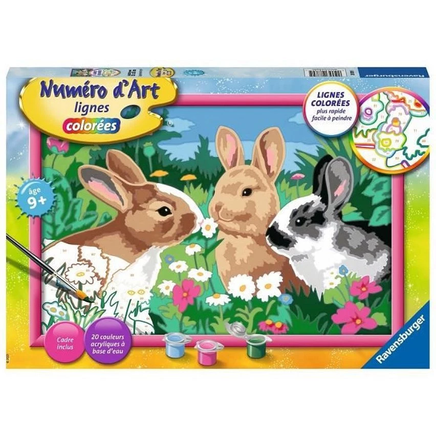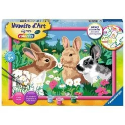 C'est facile, beau et amusant de peindre par numéro grâce aux lignes colorées pré-peintes ! Parmi les 7 visuels grands formats à peindre et à accrocher, ces lapins dans le pré sauront ravir les enfants et compléter leurs collections. A partir de 9 ans. Ce produit est composé de matériaux issus de forêts bien gérées certifiées FSC®, de matériaux recyclés et de matériaux issus dautres sources contrôlées (FSC-C111262).