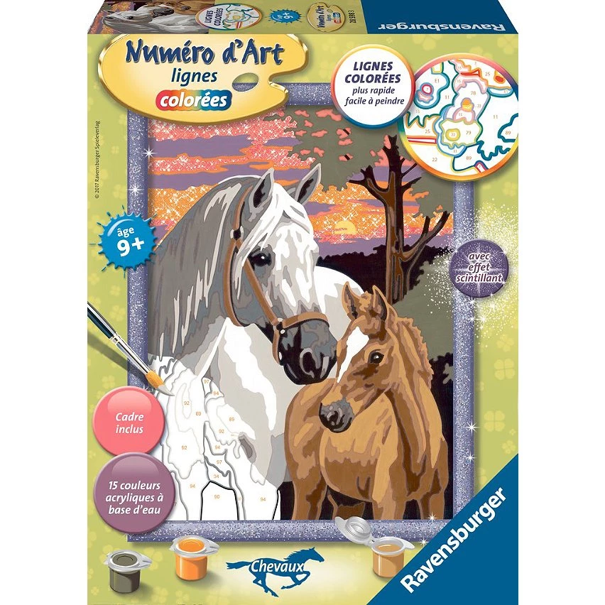 C'est facile, beau et amusant de peindre par numéro grâce aux lignes colorées pré-peintes ! Parmi les 18 visuels moyens formats à peindre et à accrocher, la jument et son poulain regardant le coucher de soleil sauront ravir les enfants et compléter leurs collections. La peinture par numéro est même scintillante grâce à l'ajout de paillettes et au cadre brillant. A partir de 9 ans. Ce produit est composé de matériaux issus de forêts bien gérées certifiées FSC®, de matériaux recyclés et de matériaux issus dautres sources contrôlées (FSC-C111262).
