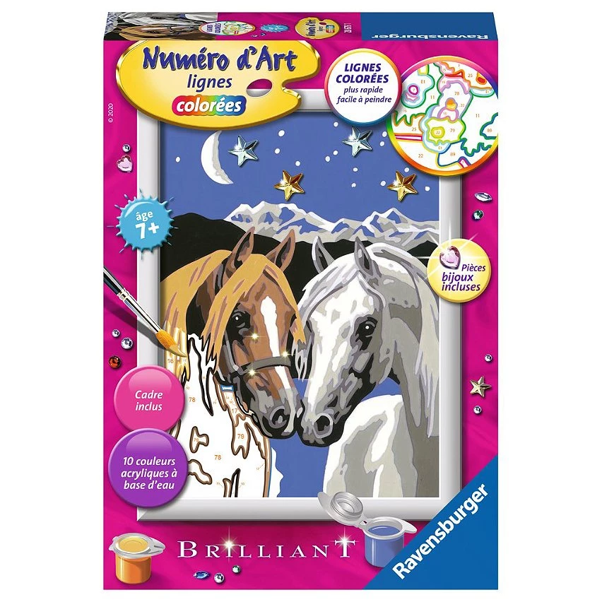 C'est facile, beau et amusant de peindre par numéro grâce aux lignes colorées pré-peintes ! Parmi les 14 visuels petits formats à peindre et à accrocher, ces 2 chevaux amoureux à la belle étoile saura ravir les enfants et compléter leurs collections. La peinture par numéro est même brillante grâce à l'ajout de pièces de bijoux incluses. A partir de 7 ans. Ce produit est composé de matériaux issus de forêts bien gérées certifiées FSC®, de matériaux recyclés et de matériaux issus dautres sources contrôlées (FSC-C111262).