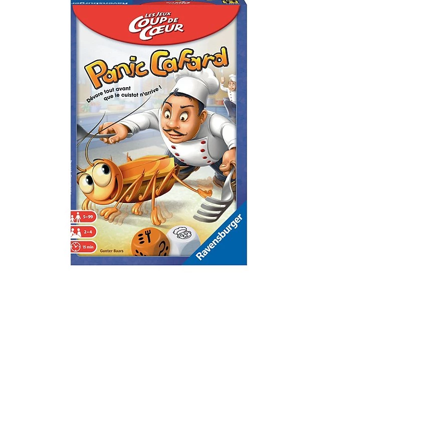 | Plus produit | UN GRAND CLASSIQUE : Un jeu d\'action et de rapidité très drôle ! Au secours, un cafard en cuisine ! Découvrez la version \'Coup de coeur\' avec des règles remaniées. Incarnez au cours de la partie le rôle de cafard ou celui de cuisinier. Le joueur qui récupère les 4 aliments remporte la partie. Qui gagnera cette chasse effrénée ? VERSION COUP DE CUR : Vous adorez Panic Cafard ! Vous en voulez toujours plus et où que vous alliez ? Grâce à la version Coup de Cur, Panic Cafard vous suivra partout. Avec son petit format de boîte, glissez-le dans votre sac et jouez où que vous soyez ! Avec son prix malin, ce jeu est un sans faute assuré ! UN OBJECTIF SIMPLE pour toute la famille. Chaque joueur incarne un cafard qui essaye de s\'emparer, un par un, des quatre aliments à son menu, avant de retourner se réfugier le plus vite possible dans son trou. Mais attention au cuisinier qui peut surgir à tout moment ! Soyez prêt à fuir. PARTIES RAPIDES : Le jeu idéal pour un après-midi amusant pour 2 à 4 joueurs : grâce au suspense permanent, aux règles de jeu simples et aux tours de jeu courts, même les plus petits sont directement enthousiasmés. Un jeu aussi facile à ranger qu\'à jouer ! CONTENU : 1 plateau de jeu, 9 couverts, 1 cafard, 4 réglettes Nourriture, 4 jetons Cafard, 2 dés, 1 règle du jeu. De 2 à 4 joueurs. A partir de 5 ans. 15 minutes de jeu en moyenne. Vous en voulez plus ? Retrouver les autres jeux classiques en version petit prix : Labyrinthe, Croque-Carotte, Qui l\'a vu ?, Ramsès et Rush Hour. |