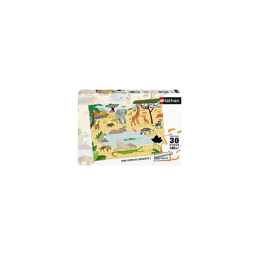 | Plus produit | LUDIQUE ET EDUCATIF : Les puzzles 30 pièces Nathan permettent à l\'enfant de trouver et d\'associer plus facilement les bonnes pièces grâce au poster à taille réelle en couleurs pour l\'aider à visualiser la taille finale de son puzzle. Les pièces du bord sont marquées au dos pour les repérer au premier coup d\'oeil. Idéal pour les enfants dès 4 ans. LA SAVANE : Le lion et sa famille se repossent au soleil pendant que les girafes se nourrisent grâces aux feuilles des arbres. Le zèbre se désaltère et l\'hippopotame se rafraîchit au plan d\'eau. Avec cette illustration mignonne et colorée, votre enfant découvrira la savane et les merveilleux animaux qui y vivent. CONTENU : 1 puzzle de 30 pièces et son poster à taille réelle en couleurs comme moyen d\'autocorrection. Les pièces du bord sont marquées au dos pour les repérer plus facilement. Dimensions du puzzle : 30 x 23 cm. SAV : Nos puzzles sont garantis 2 ans à compter de la date d\'achat pour toutes pièces manquantes ! ENVIRONNEMENT : Fabriqué en Europe, ce puzzle est composé de matériaux issus de forêts bien gérées certifiées FSC, de matériaux recyclés et de matériaux issus dautres sources contrôlées (FSC-C111262). Une qualité de fabrication impeccable : matériau extra-épais et durable résistant aux nombreuses manipulations pour s\'amuser encore plus longtemps! UN CADEAU IDEAL pour les enfants dès 4 ans. Les enfants seront ravis de recevoir ce puzzle pour Noël, un anniversaire ou juste pour le plaisir. Il permettra à l\'enfant de s\'initier de manière autonome au puzzle et/ou de permettre aux parents de partager un moment de convivialité et de détente avec leur enfant. |
