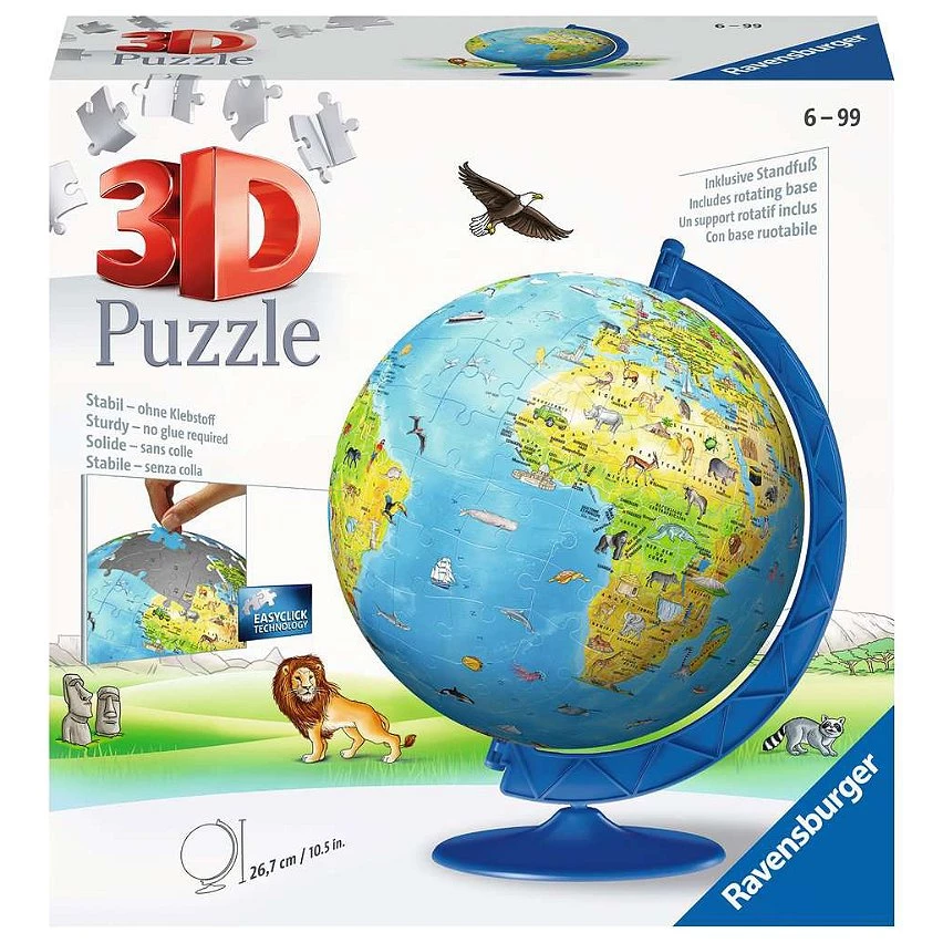 Quoi de plus amusant que de découvrir le monde pièce par pièce avec ce puzzle globe ? Grâce à la technologie Easyclick, ses pièces en plastique parfaitement incurvées s'assemblent facilement pour former une sphère solide, le tout sans colle. Chacune des 180 pièces vous emmène dans une petite expédition autour du monde ! Un diamètre de 20 cm avec de grandes pièces pour que les enfants à partir de 8 ans puissent le monter facilement. Un support rotatif en plastique permet à l'enfant de faire tourner le puzzle 3D® comme un planisphère.