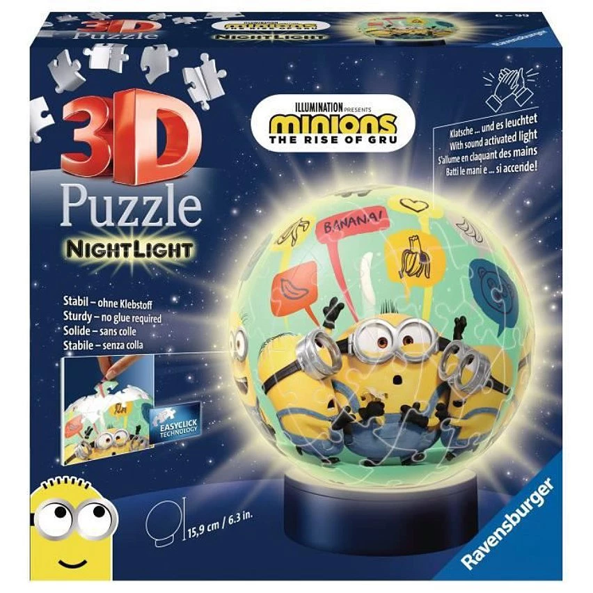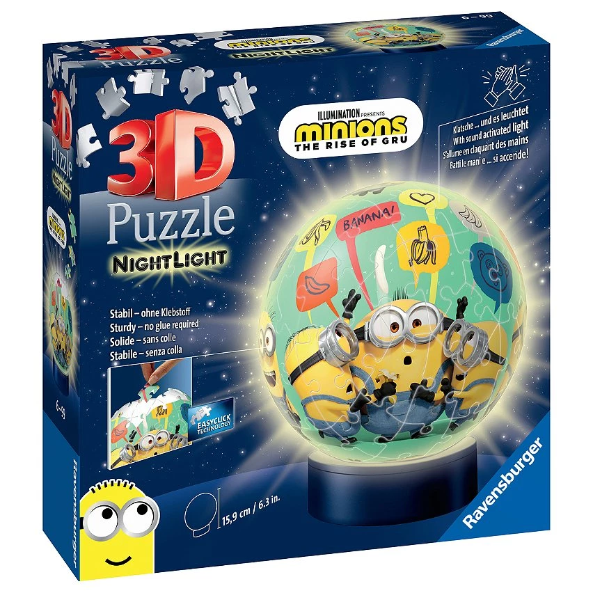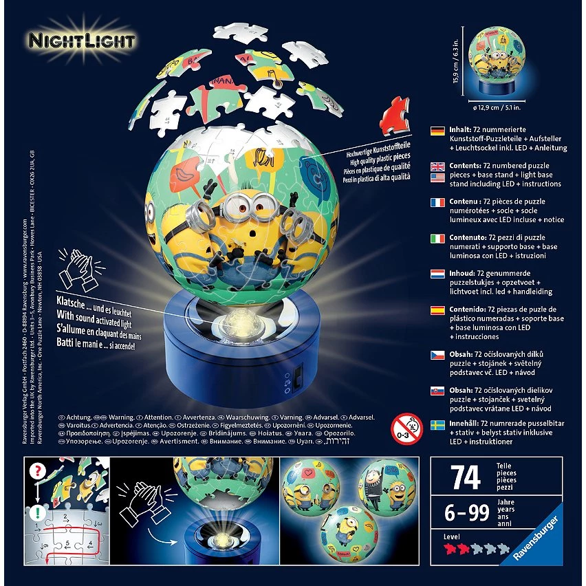Un puzzle 3D rond aux couleurs des Minions, facile à assembler grâce à ses 72 pièces numérotées. Il suffit de suivre l'ordre des numéros et le sens des flèches indiqués au verso des pièces de puzzle. Toutes les pièces s'emboitent parfaitement grâce à la technologie Easyclick. Une fois monté, le puzzle 3D reste bien stable et n'a pas besoin d'être collé. Avec son socle lumineux, il se transforme en véritable lampe qui s'allume et s'éteint lorsqu'on claque des mains !