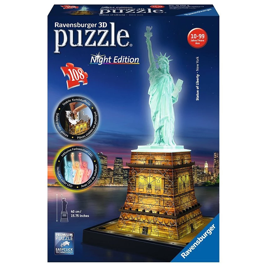 Cette superbe reproduction en 3D de la Statue de Liberté est constituée de 108 pièces de puzzles en plastique numérotées, ainsi que d'accessoires uniques pour finaliser l'édifice. La qualité de découpe des pièces -plates, incurvées ou pliables- lui assure une parfaite stabilité, le tout sans colle. Une fois assemblé, l'édifice s'illumine grâce à un éclairage intégré, avec plusieurs modes au choix : blanc tamisé, ou bien avec une alternance de couleurs. Un moyen unique et ludique de re-découvrir ce célèbre monument !