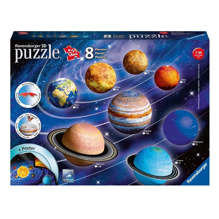 | La boîte contient | 2 puzzles de 27 pièces, 2 puzzles de 54 pièces, 2 puzzles de 72 pièces, 2 puzzles de 108 pièces, 1 poster, des accessoires, 1 notice |