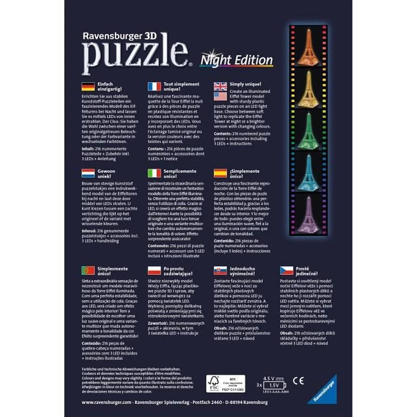 Cette superbe reproduction en 3D de la Tour Eiffel est constituée de 216 pièces de puzzles en plastique numérotées, ainsi que d'accessoires uniques pour finaliser l'édifice. La qualité de découpe des pièces -plates, incurvées ou pliables- lui assure une parfaite stabilité, le tout sans colle. Une fois assemblé, l'édifice s'illumine grâce à un éclairage intégré, avec plusieurs modes au choix : blanc tamisé, ou bien avec une alternance de couleurs. Un moyen unique et ludique de re-découvrir ce célèbre monument !