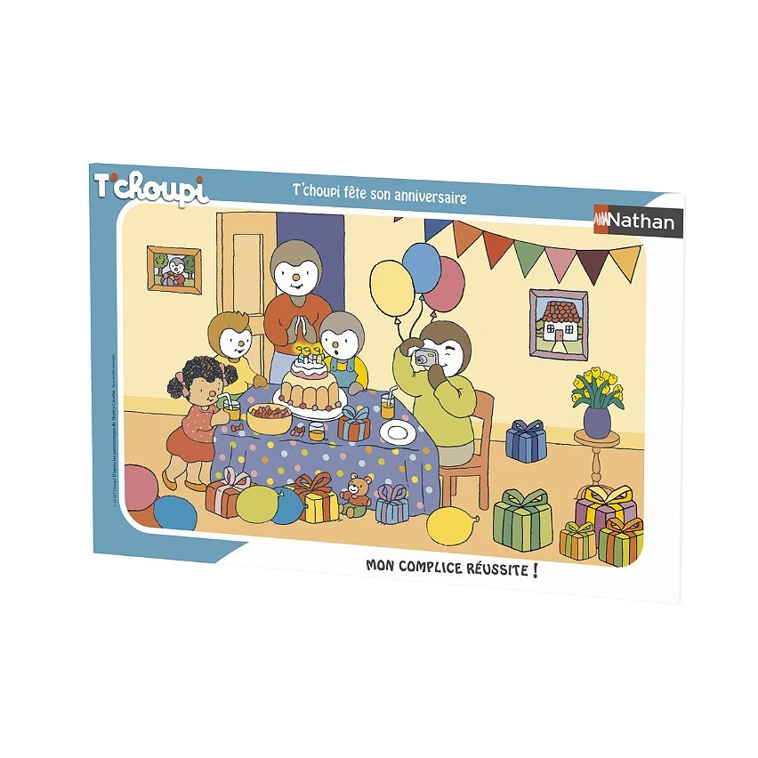 | Plus produit | LUDIQUE ET EDUCATIF : Les puzzles cadres Nathan permettent à l\'enfant de trouver et d\'associer plus facilement les bonnes pièces sur le fond du cadre grâce à l\'image imprimée et aux lignes de découpe qui y sont gravées. L\'enfant découvre en toute autonomie dès 3 ans le principe d\'association, et développe sa motricité et sa concentration. ANNIVERSAIRE AVEC T\'CHOUPI : T\'choupi fête son anniversaire avec ses amis et sa famille. Son papa et sa maman lui ont préparé un gros cadeau et une belle décoration colorée. Pendant que T\'choupi souffle ses bougies, son papa le prend en photo pour se créer des souvenirs. Ensuite ce sera l\'heure d\'ouvrir les cadeaux ! CONTENU : 1 puzzle de 15 pièces, 1 cadre avec l\'image du puzzle imprimée et les lignes de découpe gravées dans le fond. Dimensions du puzzle : 25 x 14,5 cm (dimensions avec cadre : 29,5 x 19 cm). SAV : Nos puzzles sont garantis 2 ans à compter de la date d\'achat pour toutes pièces manquantes ! ENVIRONNEMENT : Fabriqué en Europe, ce puzzle est composé de matériaux issus de forêts bien gérées certifiées FSC, de matériaux recyclés et de matériaux issus dautres sources contrôlées (FSC-C111262). Une qualité de fabrication impeccable : matériau extra-épais et durable résistant aux nombreuses manipulations pour s\'amuser encore plus longtemps! UN CADEAU IDEAL pour les enfants dès 3 ans. Les enfants seront ravis de recevoir ce puzzle pour Noël, un anniversaire ou juste pour le plaisir. Il permettra à l\'enfant de s\'initier de manière autonome au puzzle et/ou de permettre aux parents de partager un moment de convivialité et de détente avec leur enfant. |