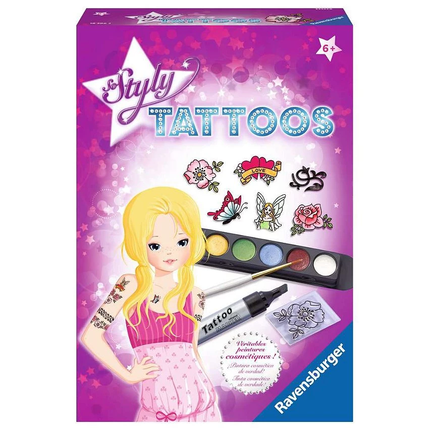 Un coffret très tendance pour réaliser ses propres tatouages et les décorer soi-même à laide de peintures cosmétiques professionnelles. Tout le nécessaire est réuni pour inventer son look. Grâce aux 6 tampons, cest facile de réaliser son dessin et de le peindre avec les 5 couleurs de peintures cosmétiques. Idéal pour allier le plaisir de créer à celui de se faire belle entre copines ! A partir de 6 ans. Ce produit est composé de matériaux issus de forêts bien gérées certifiées FSC®, de matériaux recyclés et de matériaux issus dautres sources contrôlées (FSC-C111262).