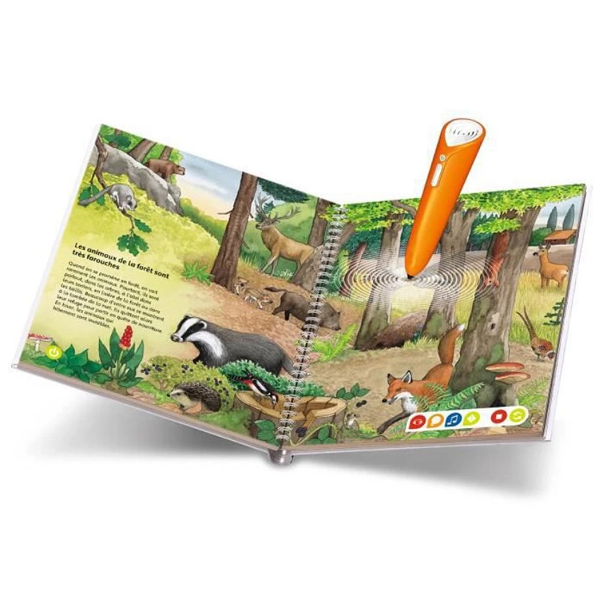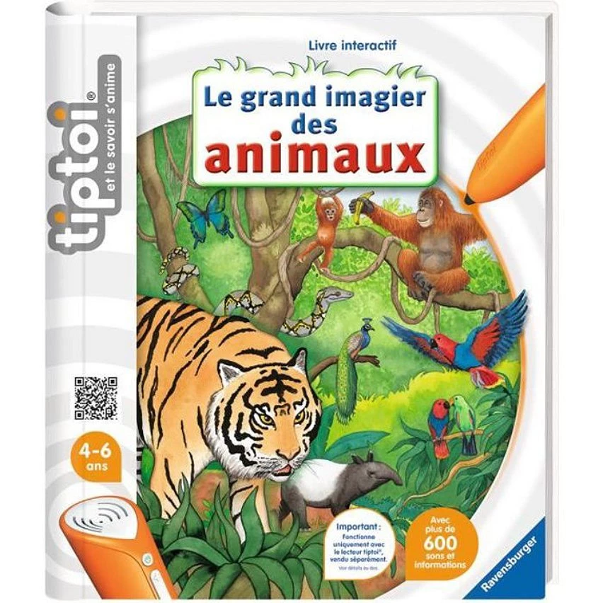 | Plus produit | SANS ECRAN : tiptoi®, cest la promesse dun jeu éducatif interactif sans écran ! Comment ça marche ? il suffit à l\'enfant de pointer le lecteur sur une image ou un texte. Et comme par magie, il entendra des sons, des dialogues et des musiques. tiptoi® permet aux enfants dapprendre en samusant en proposant un contenu riche, varié et de qualité. DECOUVERTE : pars à la rencontre des animaux dans les plus beaux paysages. En passant par la forêt, la montage, les lacs, la jungle, la savane et la mer. Une vraie mine d\'or pour connaitre tous les animaux et devenir un véritable expert dans le domaine de la faune et de la flore ! Ce livre fonctionne uniquement avec le lecteur tiptoi®. +PRODUIT : tiptoi® promet à votre enfant des heures de découverte et dapprentissage en toute autonomie sur des contenus riches et variés. Très facile à emporter partout, le lecteur possède même une prise casque ! Le volume sonore est réglable. Le tout pour un contenu éducatif sans écran ! EVOLUTIF : une fois équipé du lecteur tiptoi®, votre enfant peut découvrir dautres thématiques qui le passionnent et adaptées de 3 à 10 ans : les pompiers, les bébés animaux ou le corps humain… Il existe une large collection de livres, jeux et globe, tous compatibles avec le lecteur tiptoi®. INTERACTIF : Livre \'Le grand imagier des animaux\', 16 pages. Ce livre interactif fonctionne uniquement avec le lecteur tiptoi® et nécessite le téléchargement gratuit du fichier audio sur le site internet Ravensburger ou sur linterface tiptoi® manager. Lecteur tiptoi® vendu séparément ! |