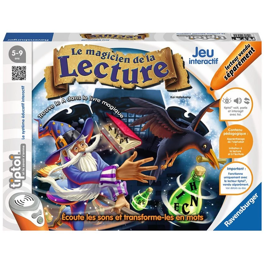 | Plus produit | tiptoi®, cest la promesse dun jeu éducatif interactif sans écran ! Comment ça marche ? il suffit à l\'enfant de pointer le lecteur sur une image ou un texte. Et comme par magie, il entendra des sons, des dialogues et des musiques. Fonctionne avec le lecteur tiptoi® vendu séparément ! Ce jeu interactif fonctionne uniquement avec le lecteur tiptoi® et nécessite le téléchargement gratuit du fichier audio sur le site internet Ravensburger ou sur linterface tiptoi® manager. Ecoute les sons, transforme-les en mots et remporte le concours de magie ! Ce jeu aide les enfants à faire leurs premiers pas vers la lecture. Votre enfant écoutera les sons et les transformera en mots pour remporter le concours de magie ! Evolutif de 3 à 10 ans : une fois équipé du lecteur tiptoi®, votre enfant peut découvrir dautres thématiques qui le passionnent. Il existe une large collection de livres, jeux et globe, tous compatibles avec le lecteur tiptoi®. Autonomie et richesse dapprentissage : tiptoi® promet à votre enfant des heures de découverte et dapprentissage en toute autonomie. Très facile à emporter partout, le lecteur possède même une prise casque ! Le volume sonore est réglable. |